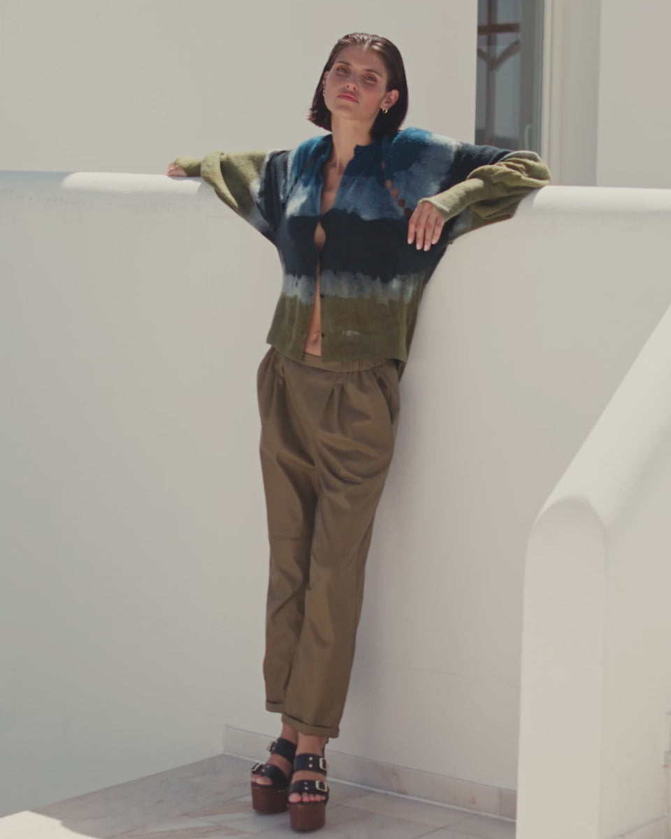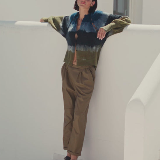 Fluffy wool cardigan enhanced by a handcrafted tie & dye in soft shades of blue and khaki. The model features an openwork finish on the armhole, wide raglan sleeves, and a soft cut for a relaxed fit. The ribbed cuffs, with a thumbhole, provide comfort and originality.