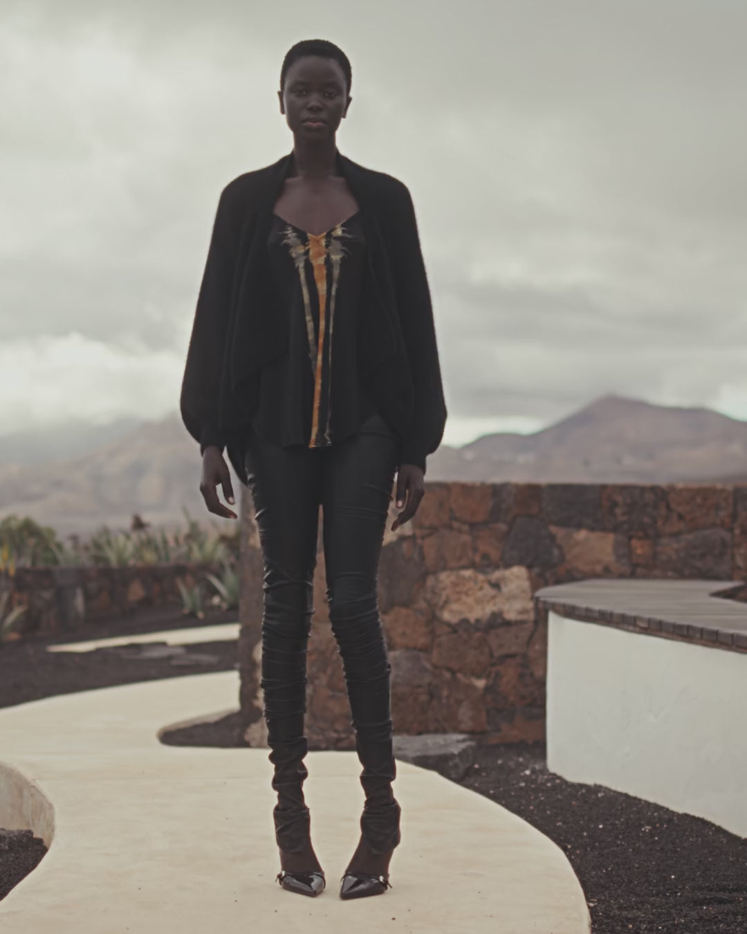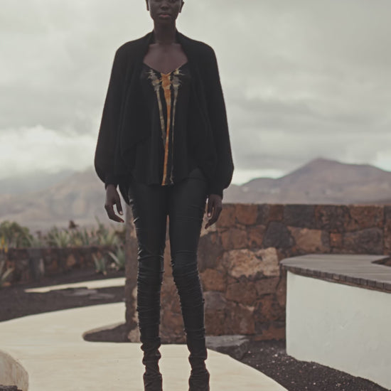 Crafted from a luxurious blend of raccoon wool and cashmere, this black cardigan captivates with its exceptional softness and supple drape. Its open, bolero-style shape gently envelops the figure and flatters all body types.