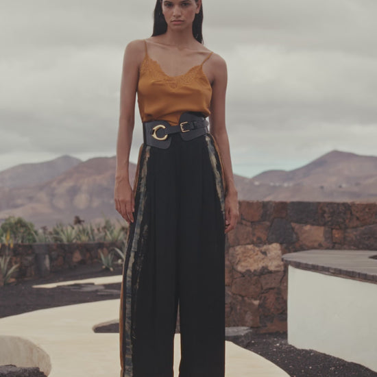 These wide-leg trousers in satin viscose captivate with their fluidity and subtle sheen. The hand-tied tie-dye print, delicately placed on the sides, creates a visually lengthening effect and makes each piece unique.