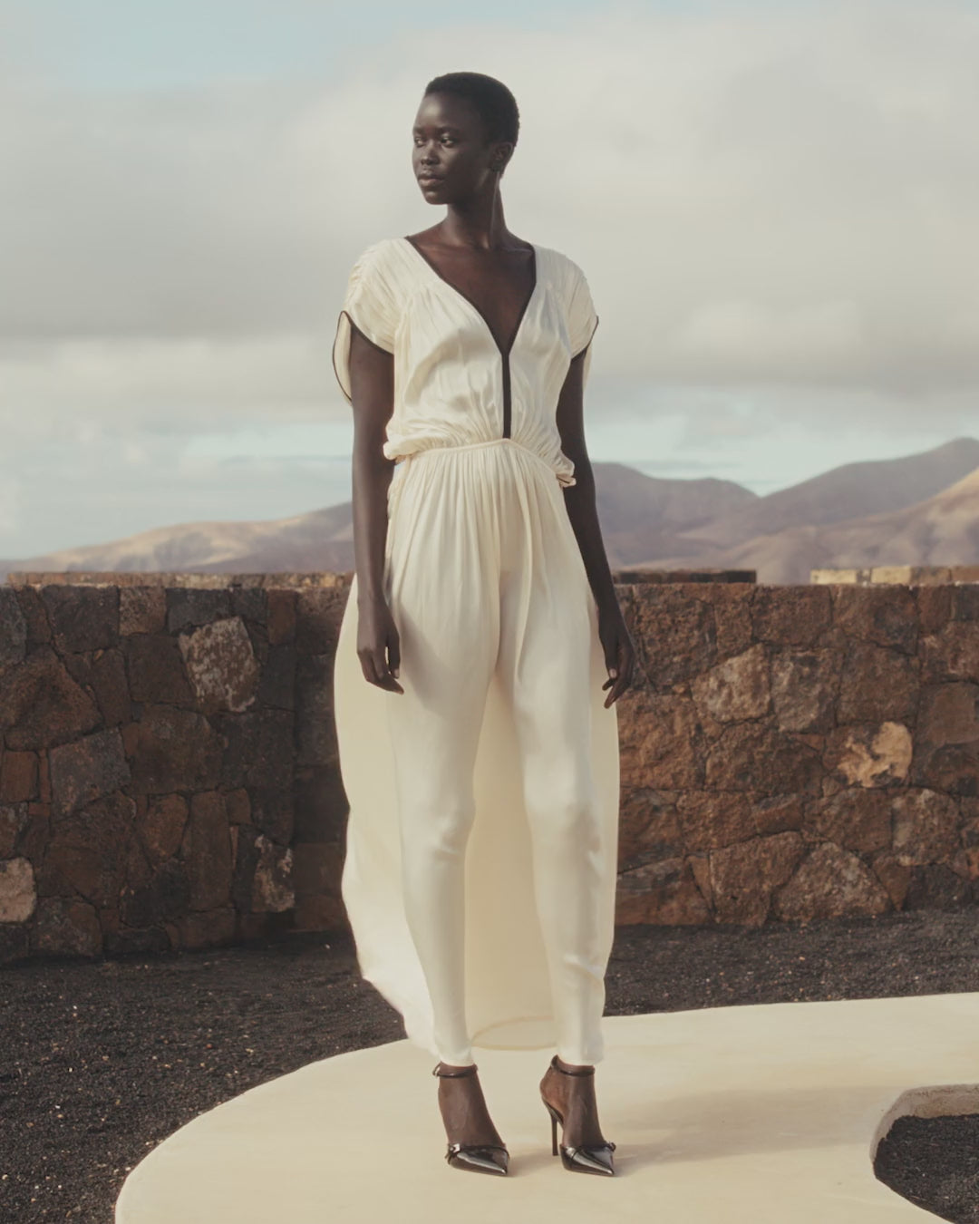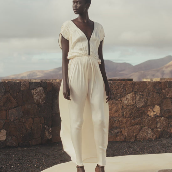A flowing, Greco-Roman-inspired dress crafted from ecru satin viscose. The V-neck and seams are highlighted with fine black bias binding for a refined, graphic contrast. A tie at the back allows for waist adjustment. The separate silky modal lining provides softness and comfort. An airy and elegant design, perfect for a sophisticated and feminine look.