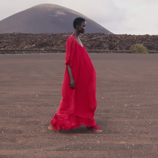 A flowing red viscose georgette dress with sheer voile sleeves for a refined, airy effect. The hem is finished with a silky modal lining that extends into a viscose chiffon flounce, adding volume and movement to the silhouette. An adjustable back neckline with a tie completes this feminine and elegant piece.