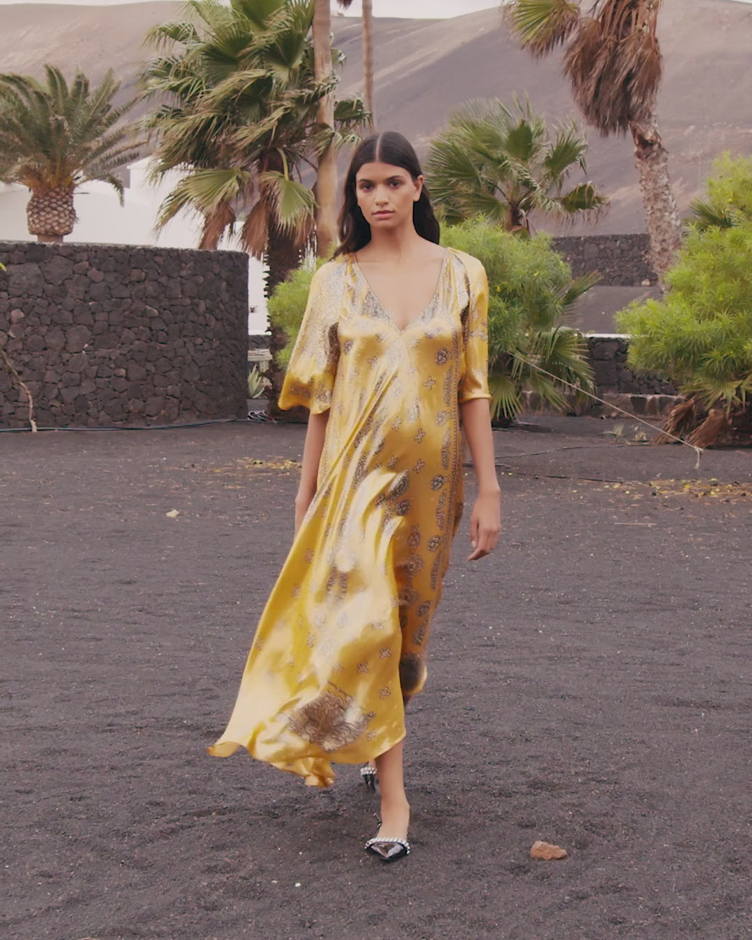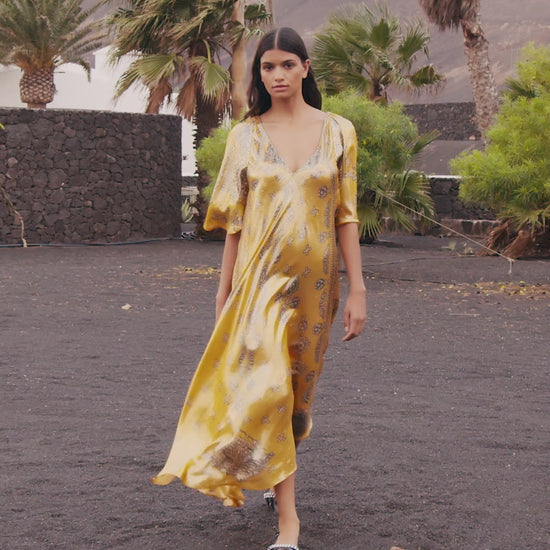 Long, flowing, shimmering silk lurex dress adorned with a bandana-inspired print. The V-neck and wide, fluttering sleeves create a feminine and airy silhouette. The delicate tie at the back adds a refined and adjustable touch. The separate silky modal lining ensures optimal comfort and an elegant drape. A spectacular piece, both bohemian and sophisticated, ideal for summer evenings.