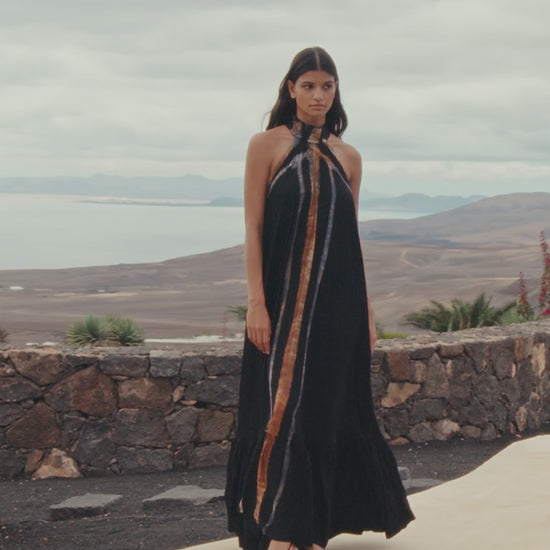 This flowing dress features an airy A-line silhouette enhanced by hand-dyed detailing, meticulously placed for an artistic effect that makes each piece unique.