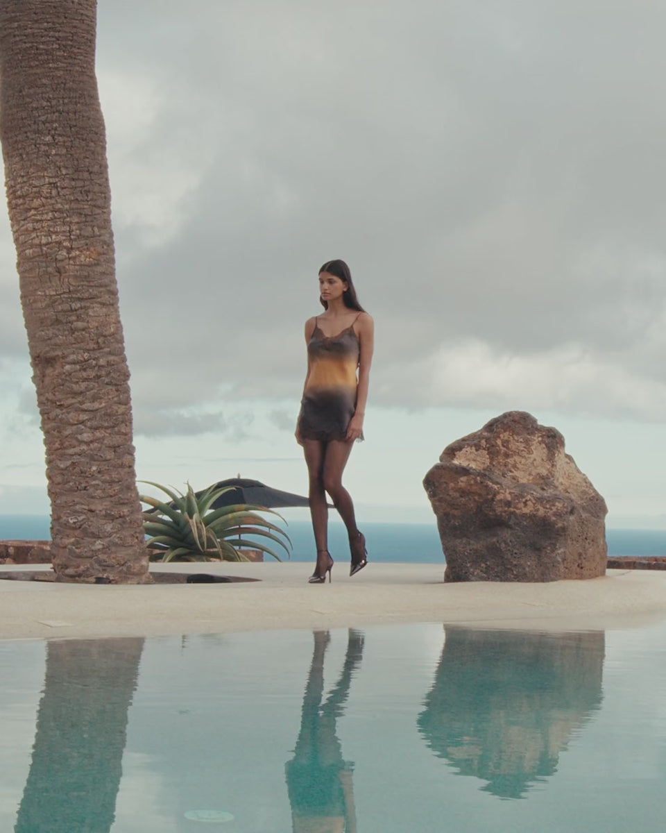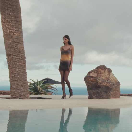Crafted from delicate silk, this nightgown captivates with its hand-dyed tie-dye in warm shades of blue and ochre.