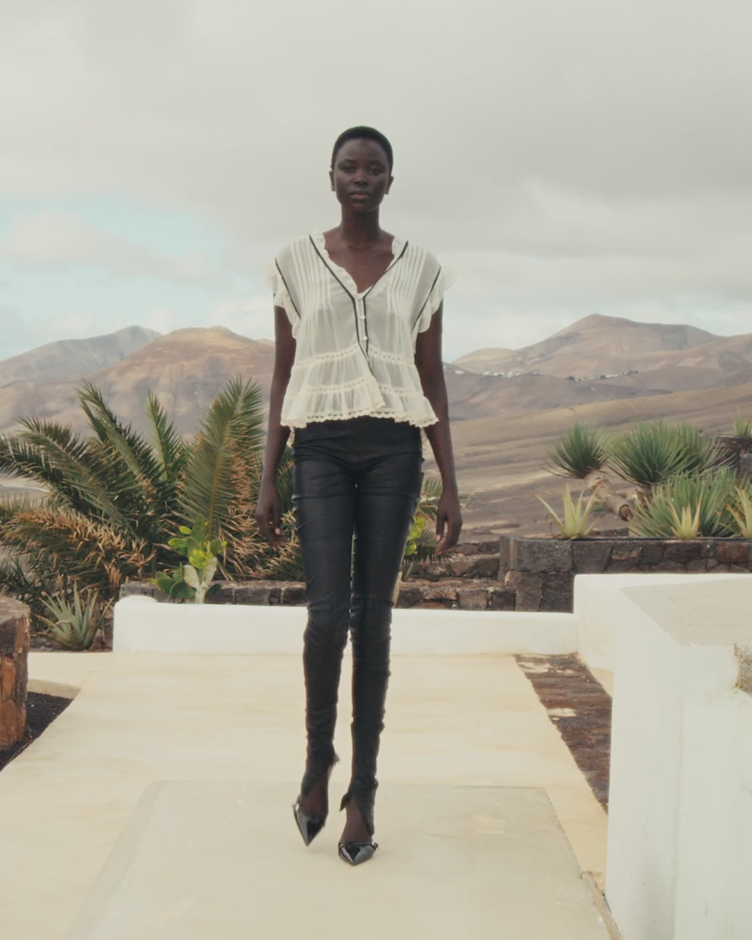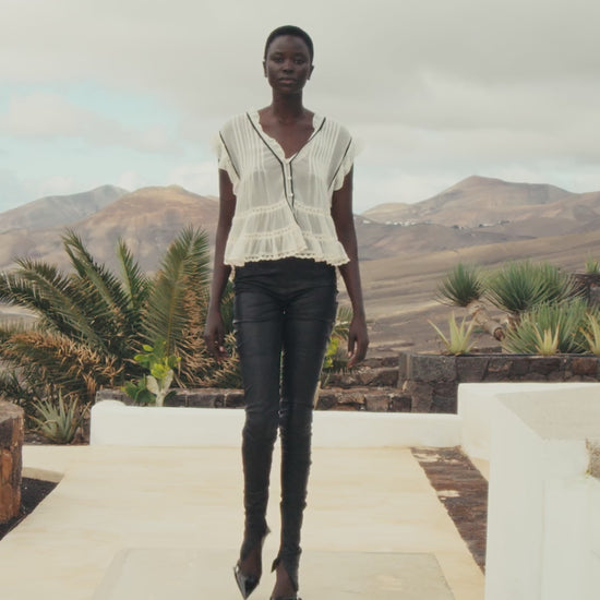 Delicate top in ecru viscose georgette, enhanced with fine black bias binding for an elegant contrast. The design is distinguished by its flat pleats, lace-trimmed ruffles, and small ruffled sleeves at the shoulders. A row of covered buttons fastens at the front for a refined and feminine touch. A top with a romantic and airy feel, perfect for a subtly vintage silhouette.