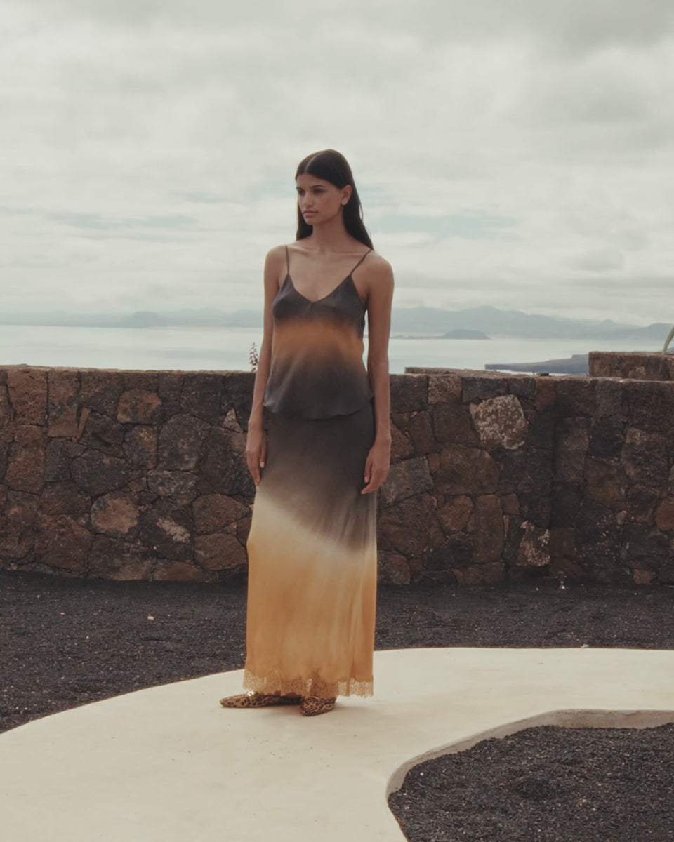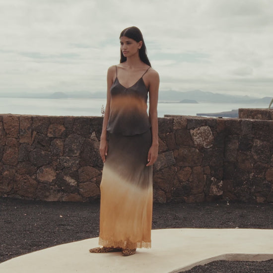 Crafted from fluid, lightweight silk, this top features a hand-dyed print, subtly nuanced between deep blue and luminous ochre.