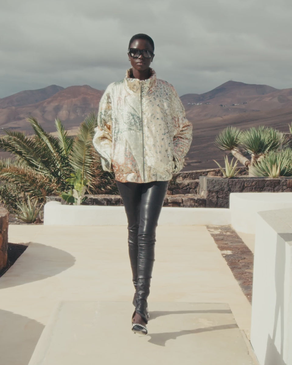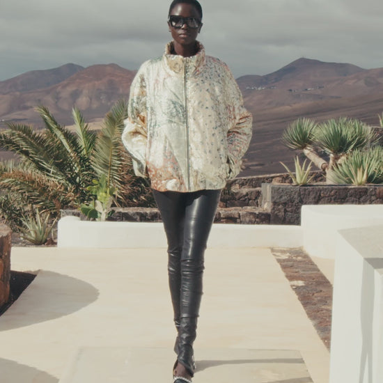 Short jacket in multicolored metallic lurex jacquard, featuring a placed print and embossed designs for a unique textured effect. The jacket is lined and quilted, with a black jersey lining for added comfort and warmth. It has a front zip, discreet side seam pockets, and an internal elasticated drawstring for a customized fit. A piece with a bold and contemporary character, combining luxurious materials with a sporty-chic style.