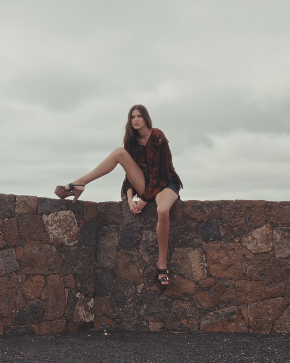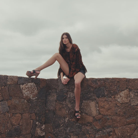 This flowing blouse in viscose georgette captivates with its lightness and airy feel. Its handcrafted tie-dye pattern, in deep shades of brown, copper, and black, lends each piece a unique and refined character.