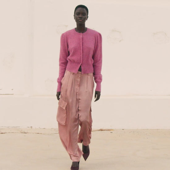 Ce cardigan mauve délicat et féminin est confectionné dans un mélange luxueux de laine de raccoon, cachemire et angora, pour un toucher doux et moelleux. Sa coupe courte et ajustée met en valeur la silhouette, tandis que les épaules légèrement froncées ajoutent une note de féminité subtile. Les boutons ton sur ton effet perle soulignent l’élégance du modèle, à porter aussi bien fermé qu’ouvert sur un débardeur ou une robe fluide.