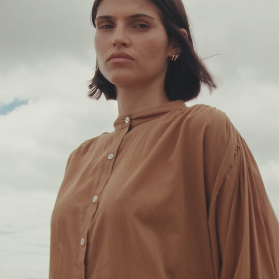 Crafted from soft, lightweight cotton voile, this shirt impresses with its relaxed, flowing cut, offering a look that's both casual and elegant. The gathered sleeves add volume and a subtle feminine touch, while the round neck and refined button placket emphasize the clean lines of the design.