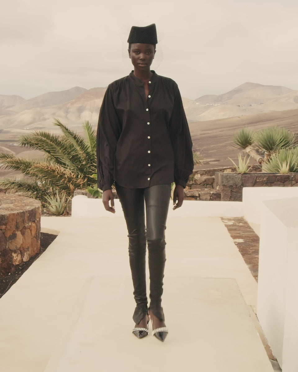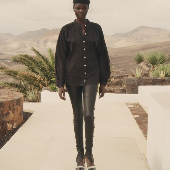 Crafted from soft, lightweight cotton voile, this shirt impresses with its relaxed, flowing cut, offering a look that's both casual and elegant. The gathered sleeves add volume and a subtle feminine touch, while the round neck and refined button placket emphasize the clean lines of the design. Its elegant, timeless black hue flatters the complexion and pairs effortlessly with any outfit.