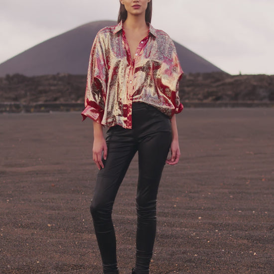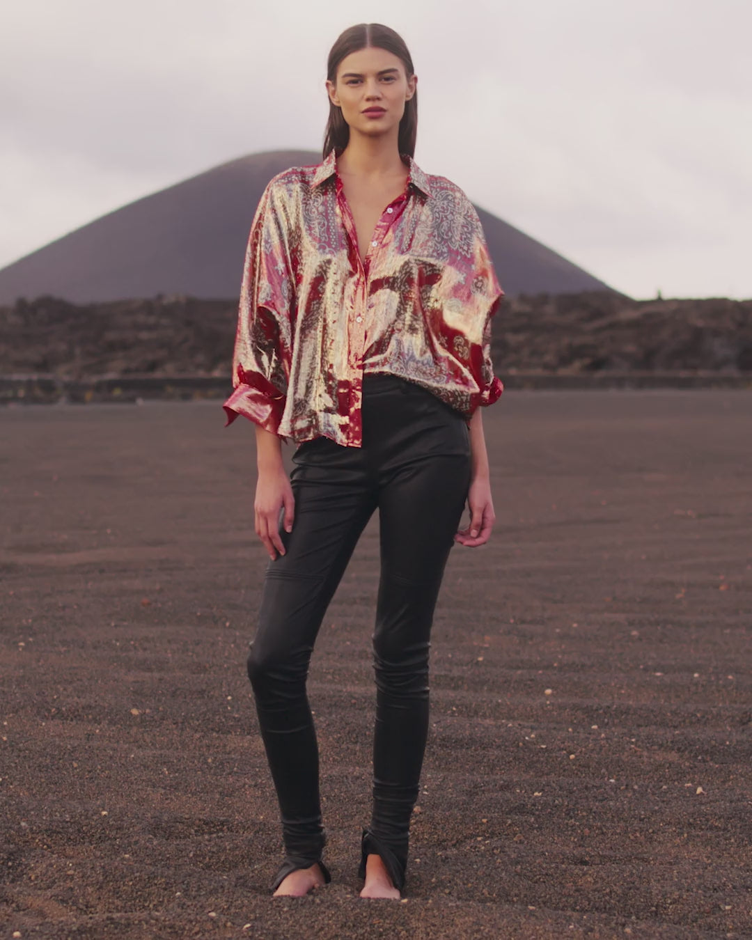 A fluid shirt in shimmering lurex silk, enhanced by a bandana-inspired print. Its relatively straight cut and wide, soft armholes create a fluid drape and a relaxed look. Featuring a classic shirt collar and a slim button placket, it combines elegance and comfort. A luminous and refined piece, it can be worn open over a tank top or tucked into trousers for a modern and chic silhouette.