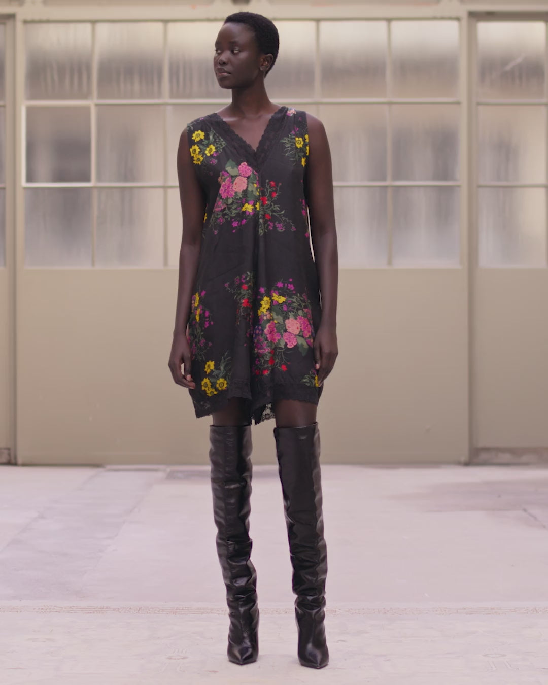 Flowing playsuit in satin viscose, adorned with a vibrant floral print on a black background. Its V-neckline, embellished with tone-on-tone lace at the front and back, adds a touch of feminine delicacy. The loose, straight cut offers a relaxed and modern look, while the side pockets add a practical and casually chic touch. An elegant and lightweight piece, perfect for summer or layered under a flowing jacket for a sophisticated and sensual look.
