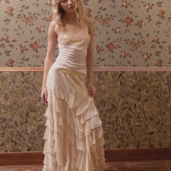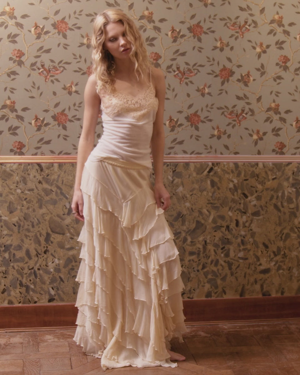 This lightweight, airy ecru viscose chiffon skirt drapes beautifully. The asymmetrical ruffles flare out in points at the front or side, creating a delicate and feminine movement with every step. The elasticated waistband ensures optimal comfort, while the silky modal lining provides softness and opacity. A poetic and refined design, perfect to pair with a flowing top or fine knit for a sophisticated, bohemian look.
