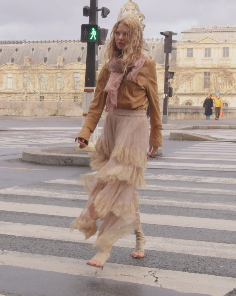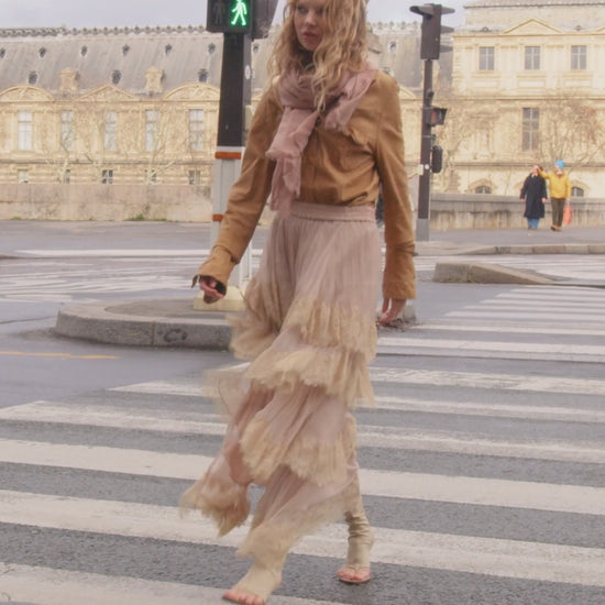 Long pink viscose chiffon skirt, adorned with ruffles delicately trimmed with beige lace. Its asymmetrical cut, shorter at the front, creates a fluid and airy effect. The elasticated waist ensures comfort and a perfect fit. A feminine and romantic piece, with subtle transparency, for a soft and poetic look.