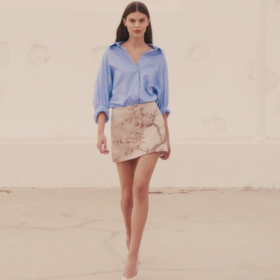 Cette mini-jupe élégante en jacquard satin beige rosé séduit par son motif floral en relief qui joue subtilement avec la lumière. Sa coupe droite et épurée met en valeur la silhouette, tandis que la fermeture zippée au dos assure un tombé parfait et un porté confortable. La doublure intérieure rose changeante apporte une touche de raffinement et de féminité à cette pièce d’inspiration couture.