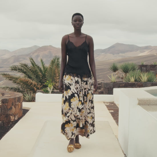 Long black organza skirt with ivory and ochre floral jacquard, coordinating with the "Soleil" coat. Its structured high waist and deep inverted pleats create an elegant and fluid drape. It features discreet side pockets and a side zip for an invisible closure. Fully lined in black, it combines refinement and couture allure, ideal for a feminine and confident silhouette.