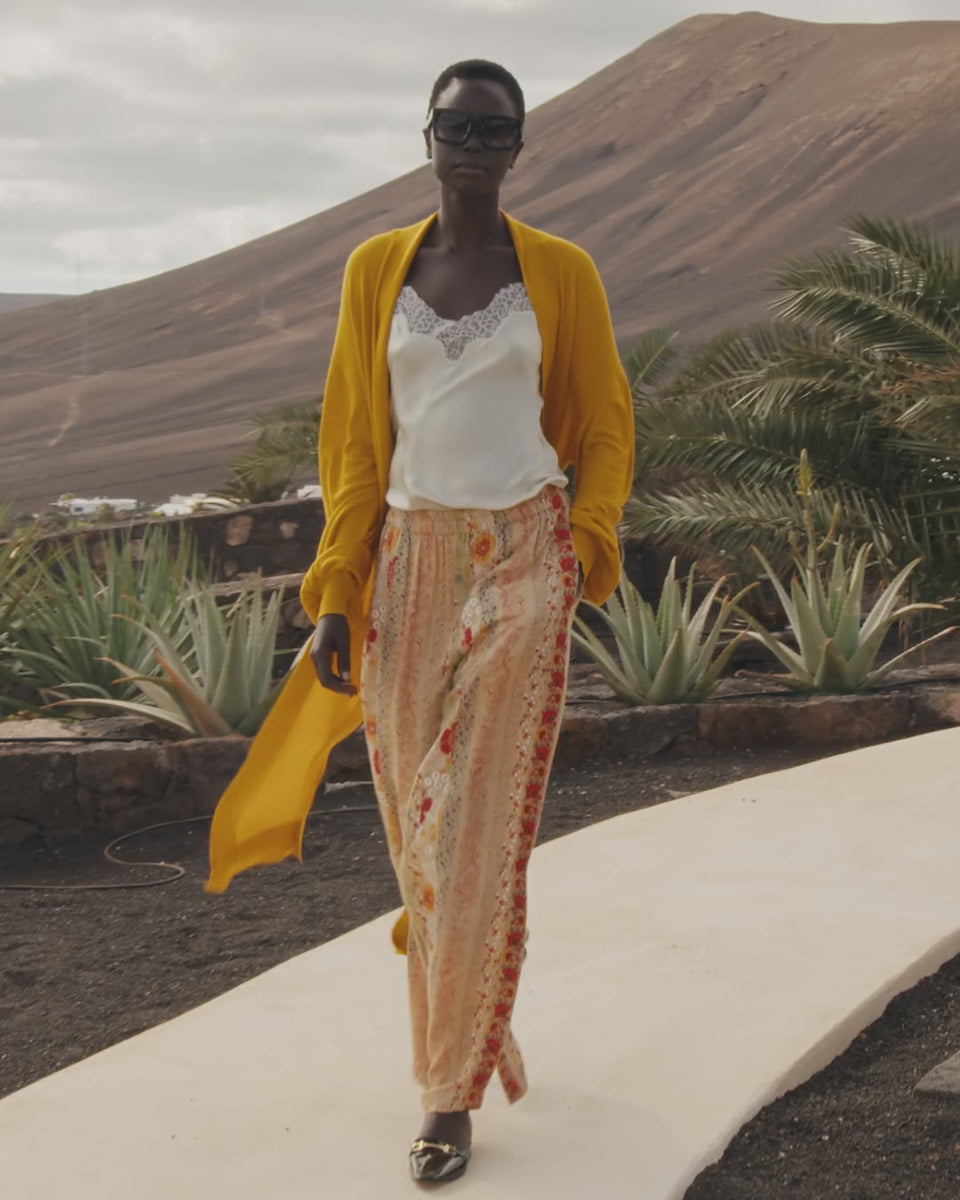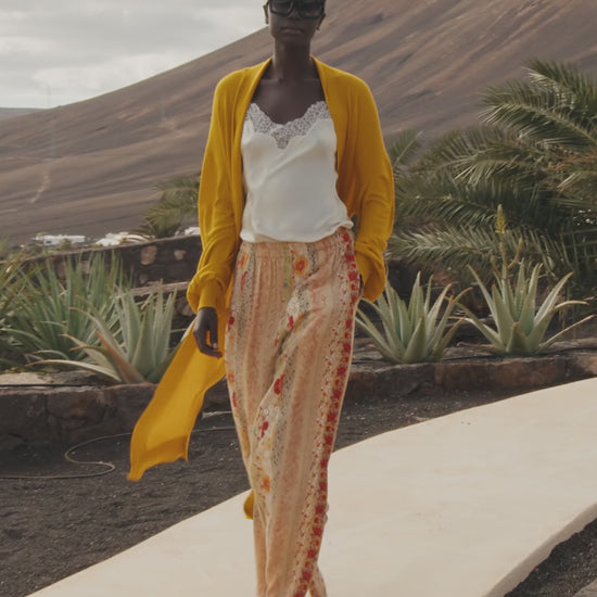 Long cardigan crafted from Italian modal and cashmere yarn, renowned for its silky softness and subtle satin sheen. Its fluid, enveloping silhouette features a kimono collar and large patch pockets for a look that is both comfortable and elegant. High side slits accentuate the natural movement of the knit, while long sleeves with fitted cuffs add a touch of structure. The ochre hue illuminates the silhouette with warmth and a modern touch—an essential piece for a refined yet relaxed style.