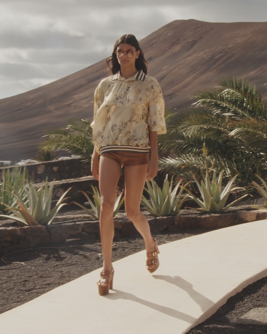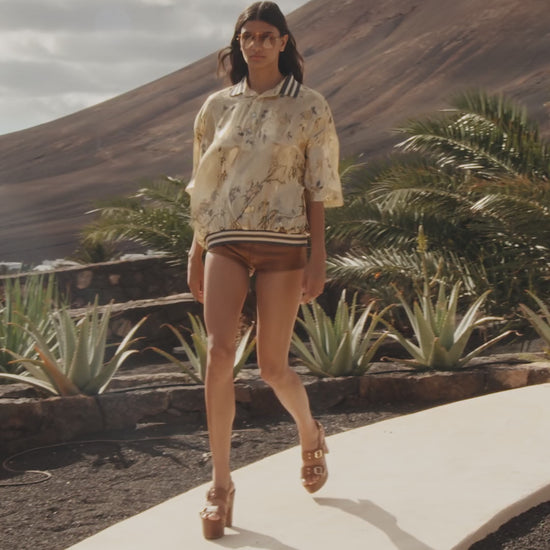 This shirt is crafted from lurex silk with a glossy, wet-look finish, lending it a touch of brilliance and modernity. The polo shirt's silhouette reimagines a sportswear classic with a striped, knitted rib-knit collar, echoed in the elasticated waistband. The loose, flowing sleeves create a comfortable, airy feel, while the large floral print at the hem emphasizes the garment's femininity and delicacy. A sophisticated yet relaxed style, perfect for adding a touch of refined elegance to any outfit.