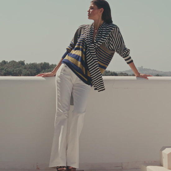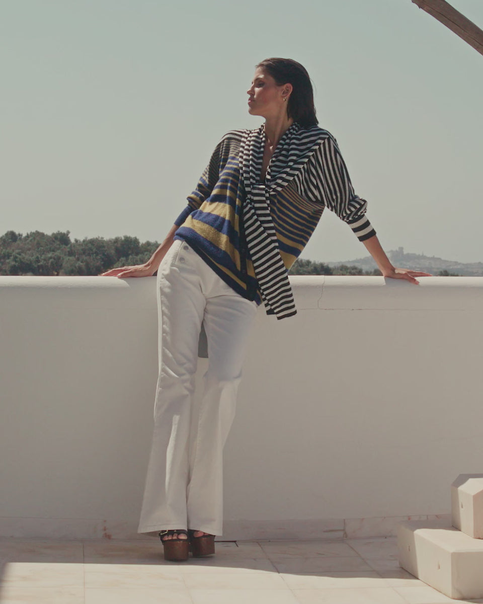 Cardigan knitted in a luxurious blend of cashmere and silk, soft and lightweight. Its asymmetrical cut is enhanced with a play of offset stripes that bring modernity and movement. A scarf is integrated into the neckline, adding an elegant and versatile touch, while the long sleeves and the khaki, navy, and delicate ochre palette complete this refined and contemporary piece.