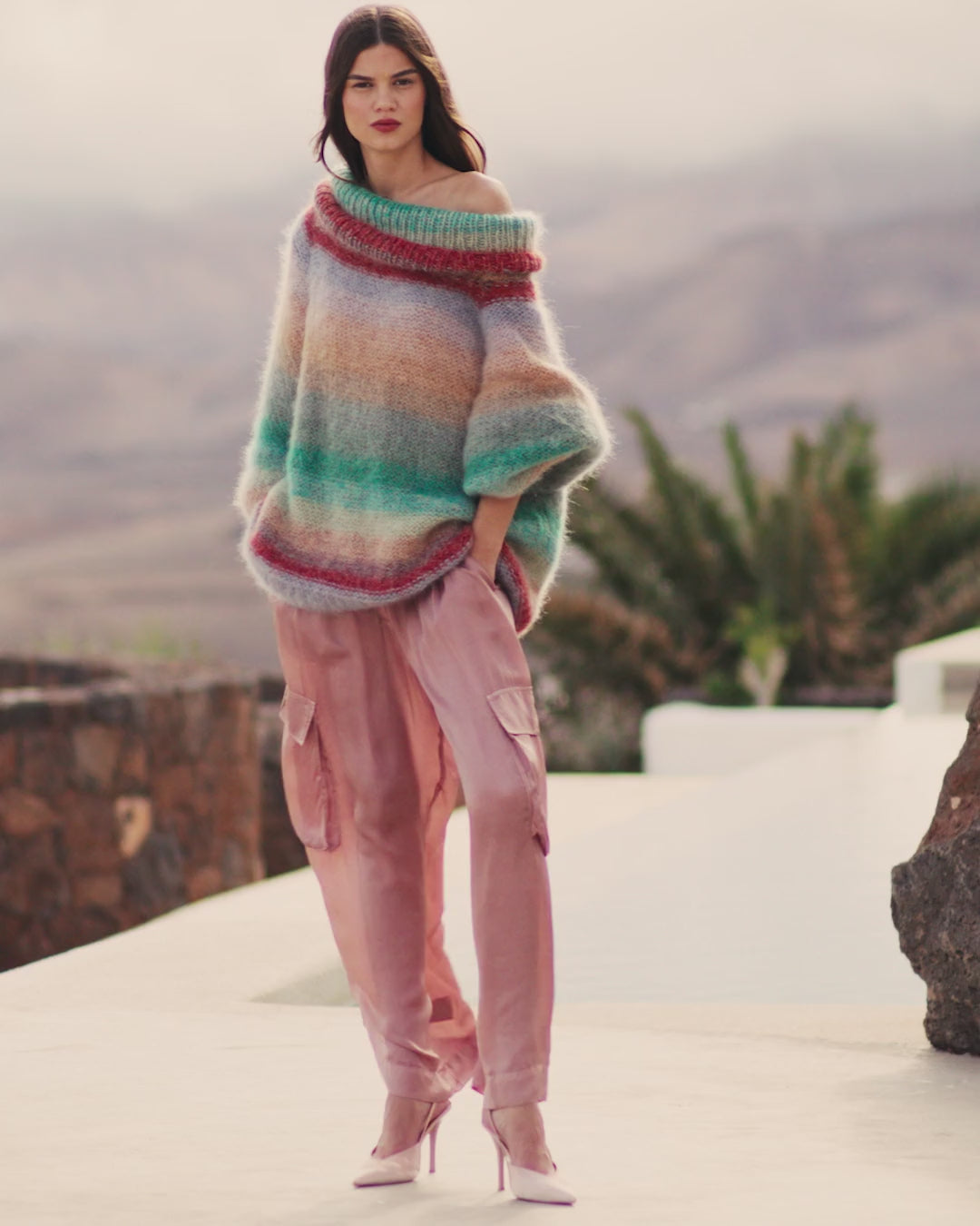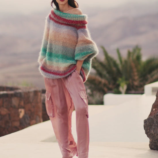 Hand-knitted in soft, airy brushed mohair, this sweater captivates with its oversized fit and wide roll neck that falls off the shoulders. Its raglan sleeves accentuate its relaxed look, while its multicolored gradient yarns create a subtle and luminous interplay of shades in blue and green. A cozy and inviting piece.