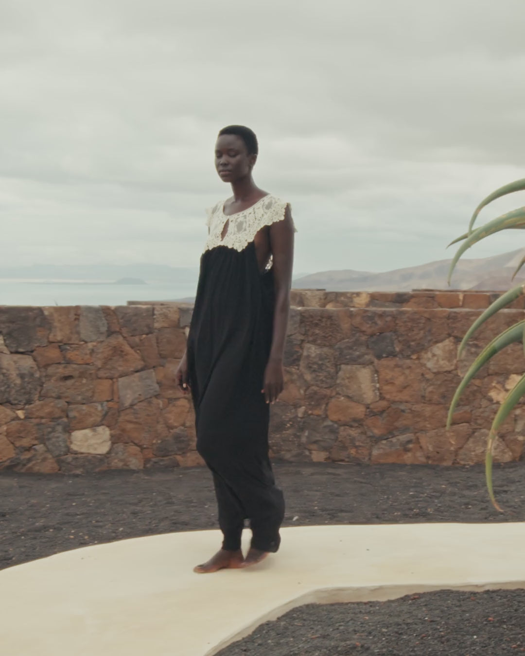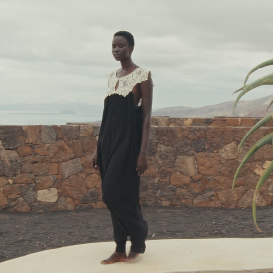Long dress in flowing viscose georgette, with a delicately worked ecru guipure lace bib. The cut is soft and lightweight, supported by a tone-on-tone lining for added comfort and opacity. A design with a romantic and timeless feel, contrasted by the duo of deep black and refined ecru.