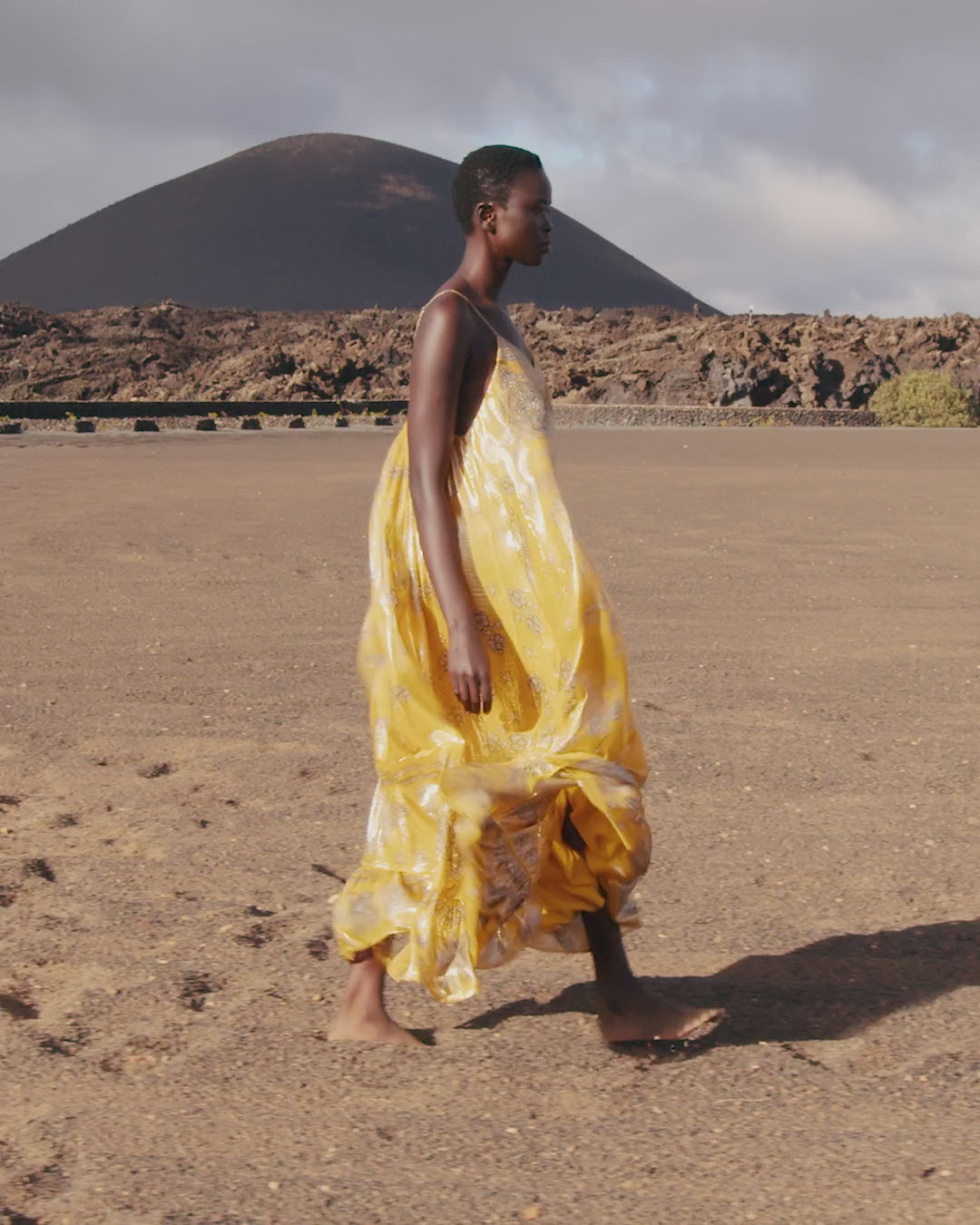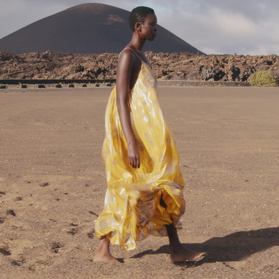 A long, flowing, shimmering yellow silk lurex dress, enhanced by a bandana-inspired print. The V-neckline is accentuated by a padded panel for added comfort and support. Adjustable straps ensure a perfect fit. The hem is finished with a delicate ruffle that adds movement and lightness to the silhouette. The attached silky modal lining guarantees a fluid drape and ideal opacity. A radiant and feminine piece, perfect for summer evenings or elegant occasions.