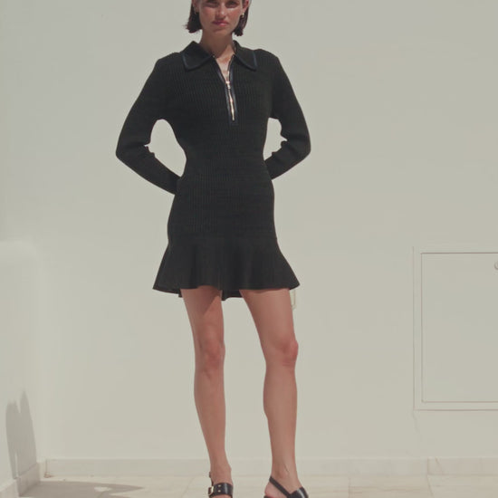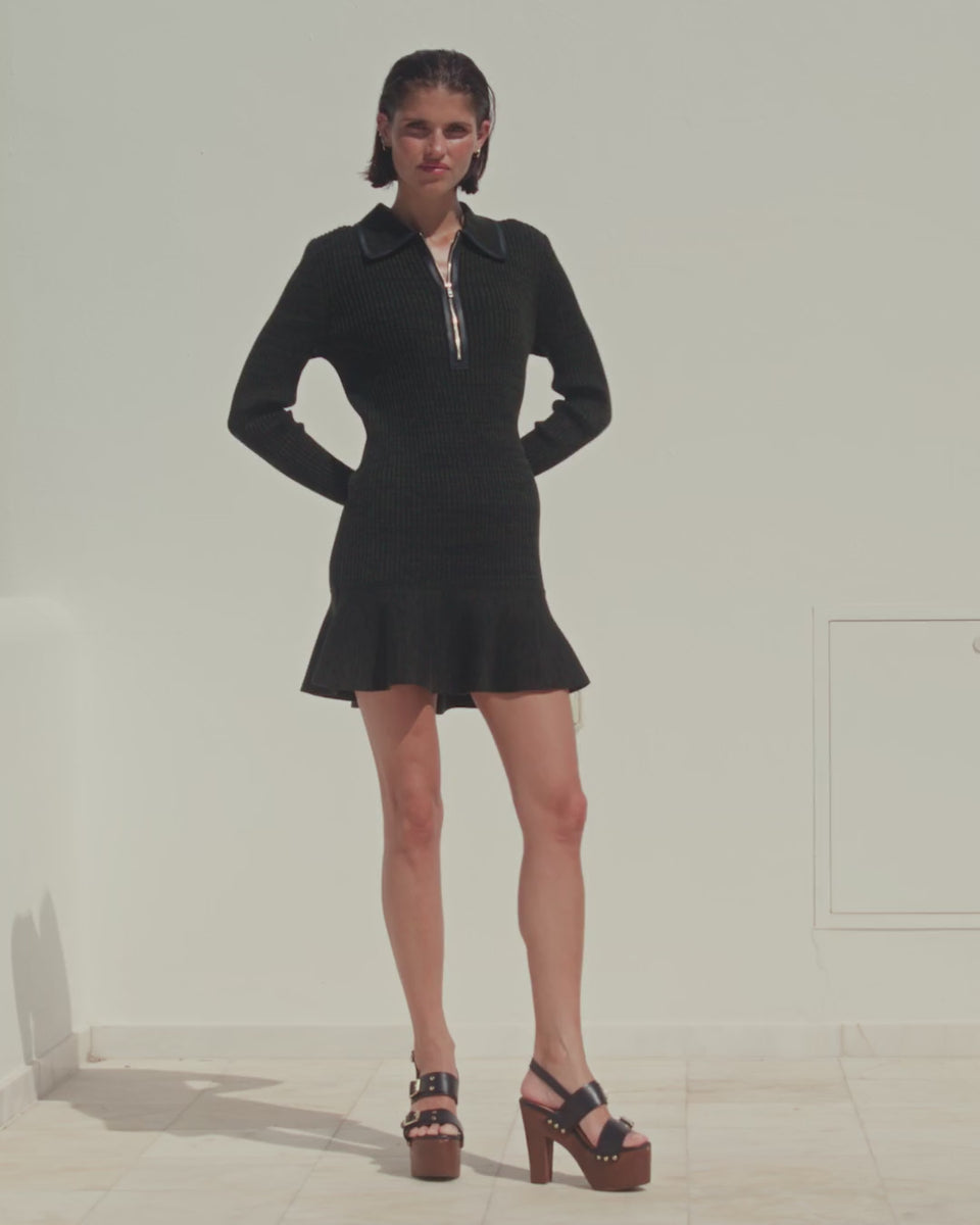 Little merino wool dress in khaki tones, crafted in a ribbed knit. The model features a polo collar enhanced with soft leather trim and a zip closure, while the godet hem adds volume and flexibility to the silhouette.