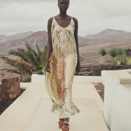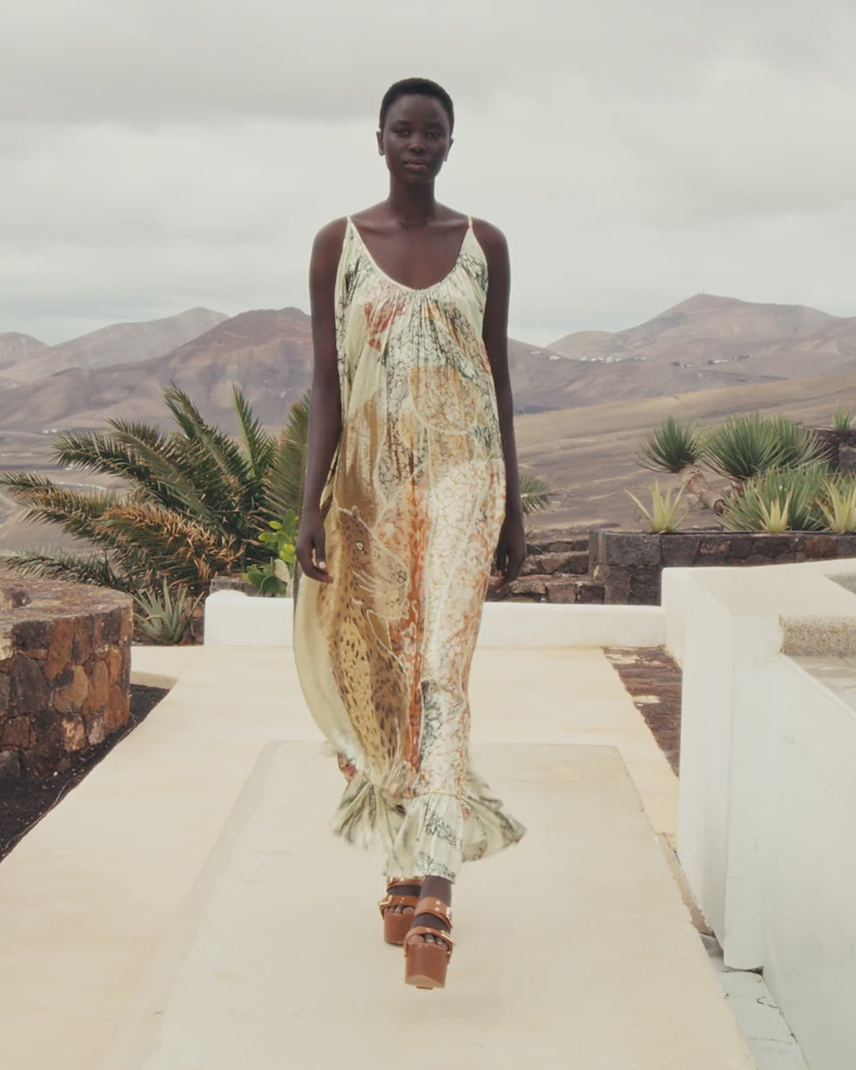 Long dress in multicolored metallic lurex jacquard, with a shimmering, textured sheen for a sparkling wet-look effect. Its fluid, airy silhouette is enhanced by a flounce at the hem and delicate adjustable straps. The subtly pleated drape highlights the light and movement, creating a glamorous and ethereal look. An exceptional piece with a festive yet sophisticated feel.