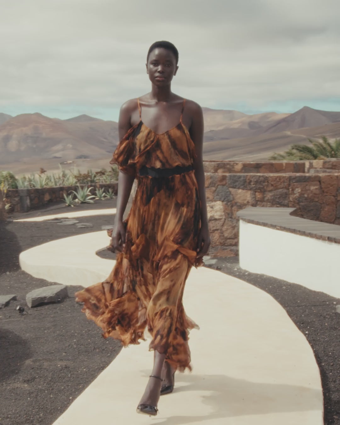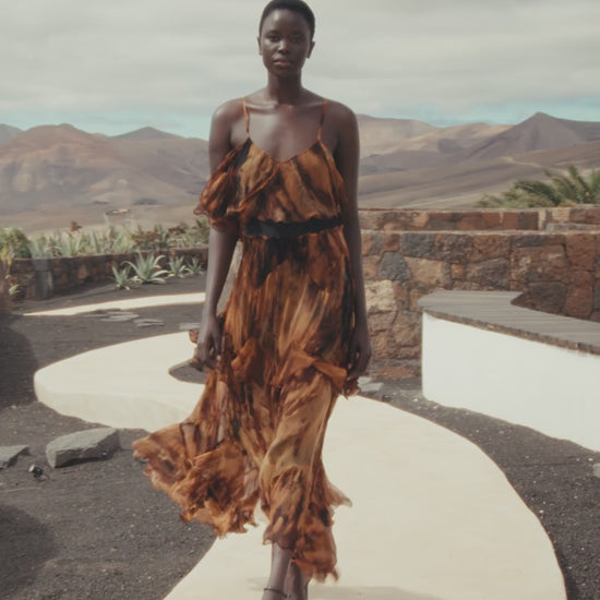 This long dress in lightweight viscose georgette captivates with its fluid drape and ethereal effect. Its multi-colored tie-dye print, in deep shades of brown, black, and blue, gives each piece a unique character.