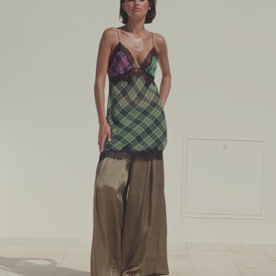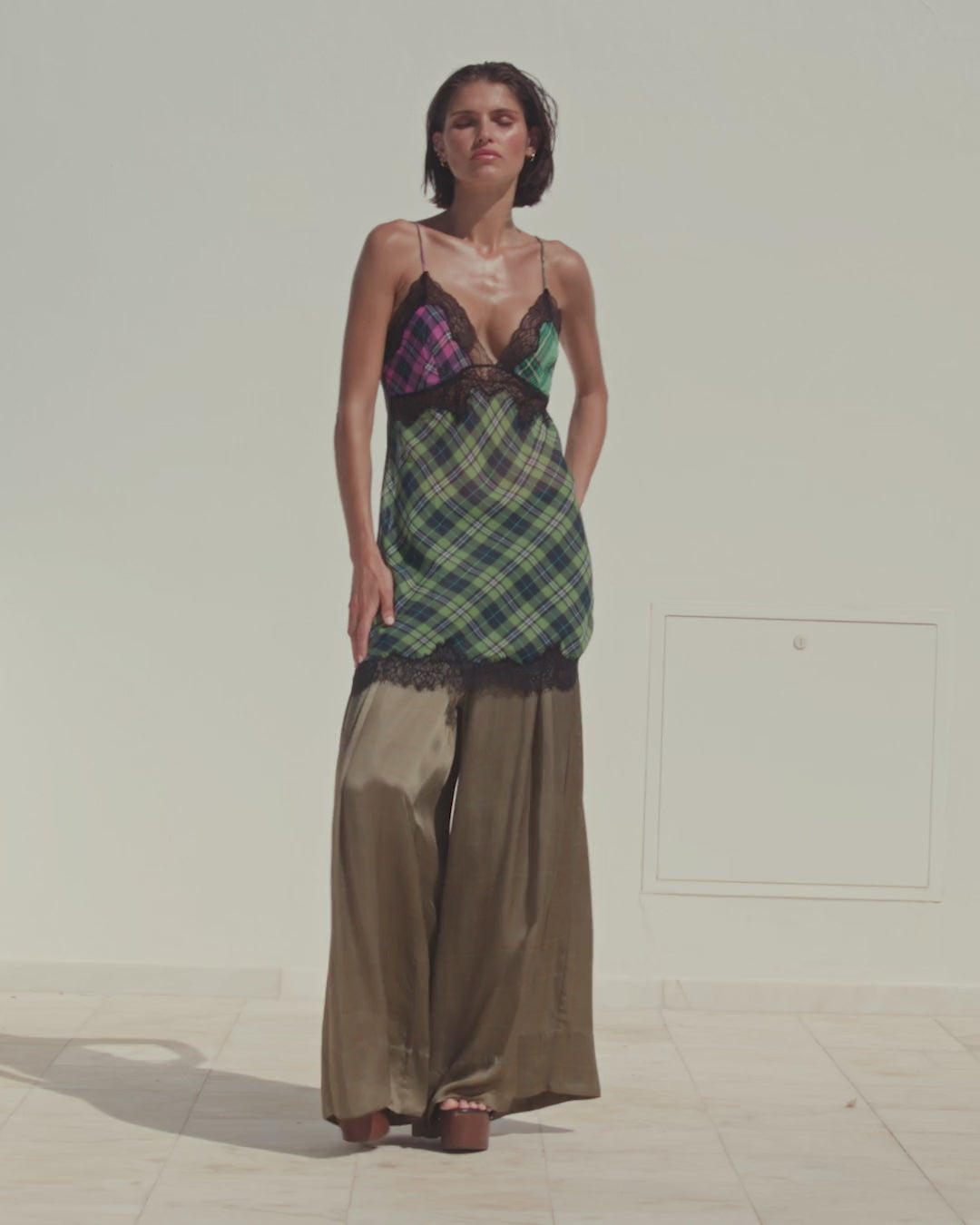 Nightie-style dress made from viscose and silk, worked in a patchwork of multicolored tartans. The model is distinguished by its thin straps and its black Chantilly-style lace finishes, delicately placed around the chest and along the hem, for a touch that is both grunge and feminine.