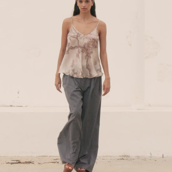 Ce top en satin de viscose séduit par son imprimé floral délicat dans des tons beiges et rosés, à l’esprit romantique et raffiné. Sa matière fluide et satinée offre un tombé léger et élégant, tandis que les bretelles réglables permettent un ajustement parfait. La forme légèrement évasée souligne la féminité de la silhouette tout en assurant un porté confortable. À associer avec la jupe ou la veste assortie pour un look sophistiqué, ou avec un denim pour une touche de modernité décontractée.