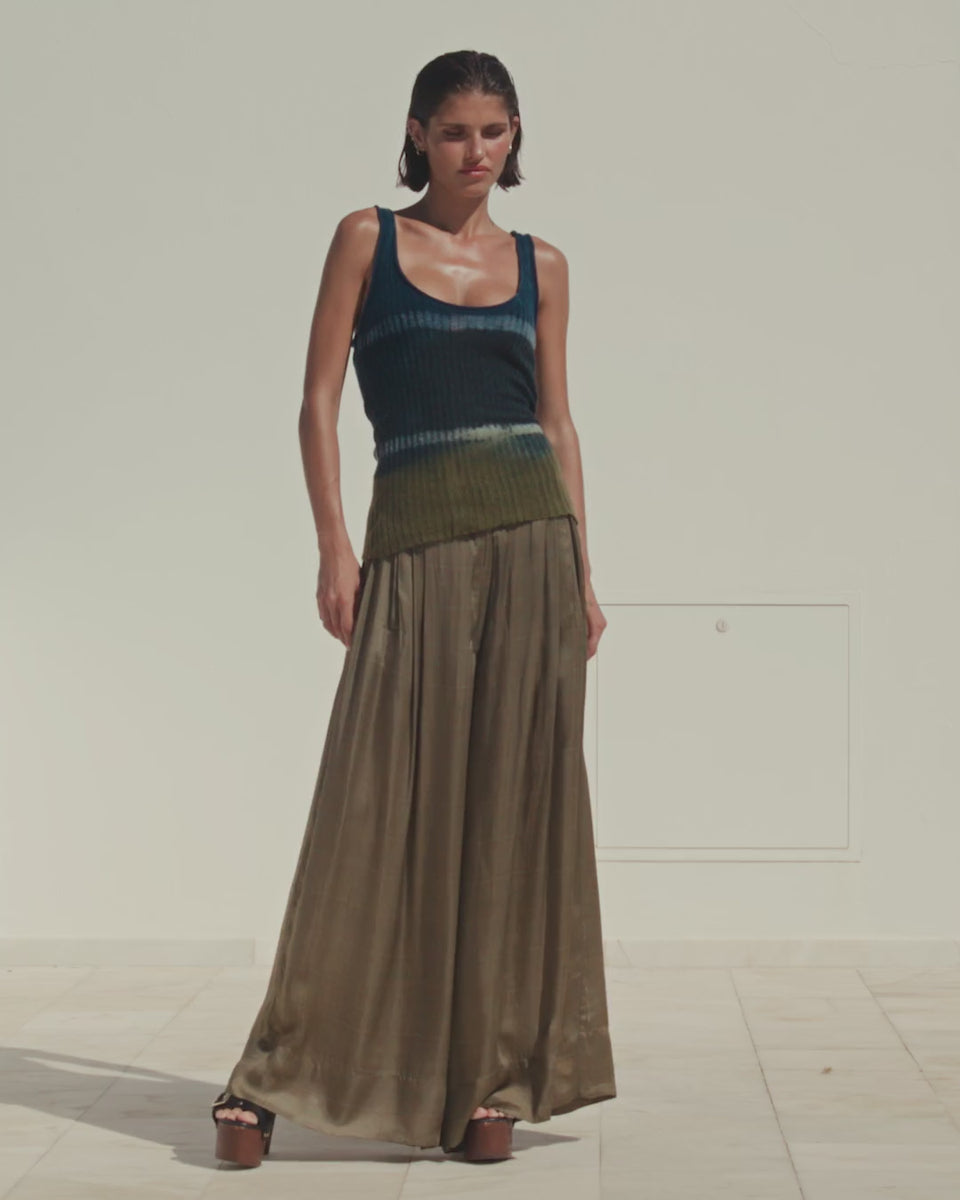 Fluffy wool tank top in flat ribbed knit, enhanced by a handcrafted tie-dye in soft shades of blue and khaki. Its close-fitting cut is enhanced by a slightly racerback, for a modern and comfortable look.