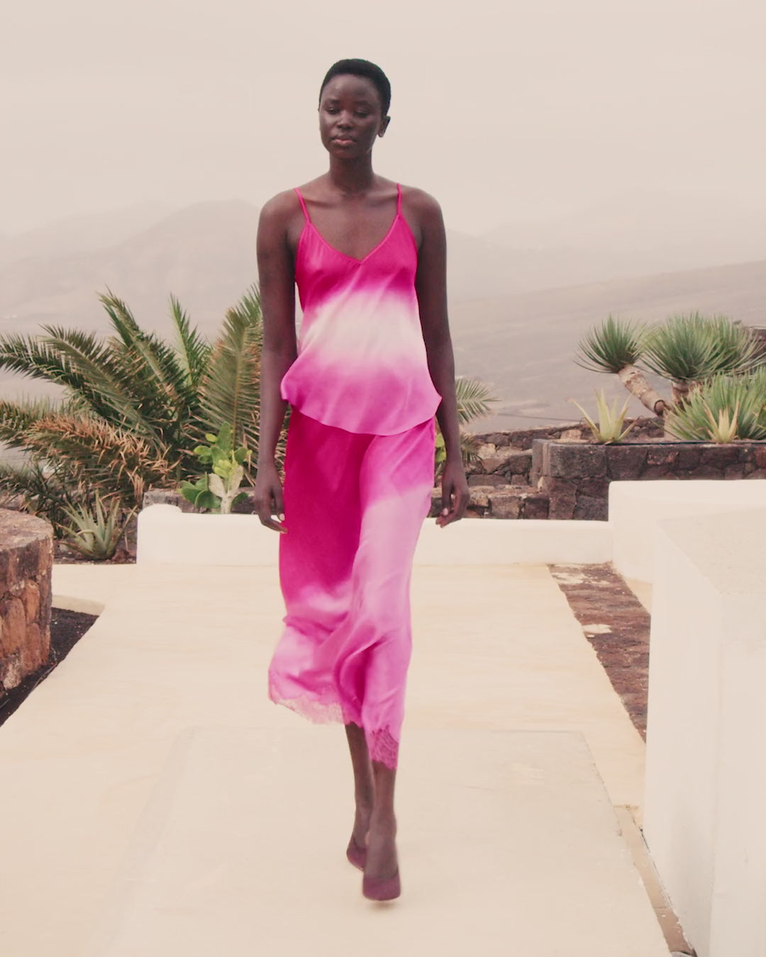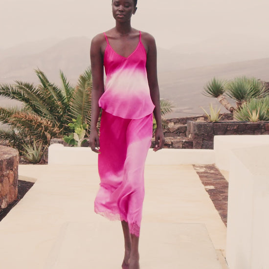 This delicate, fluid silk top captivates with its hand-tied tie-dye, creating a luminous gradient from deep pink to soft pink. Its V-neck and thin, adjustable straps accentuate femininity while offering a natural and elegant drape. A refined piece, perfect to wear alone or layered under a blazer for a bright and contemporary look.