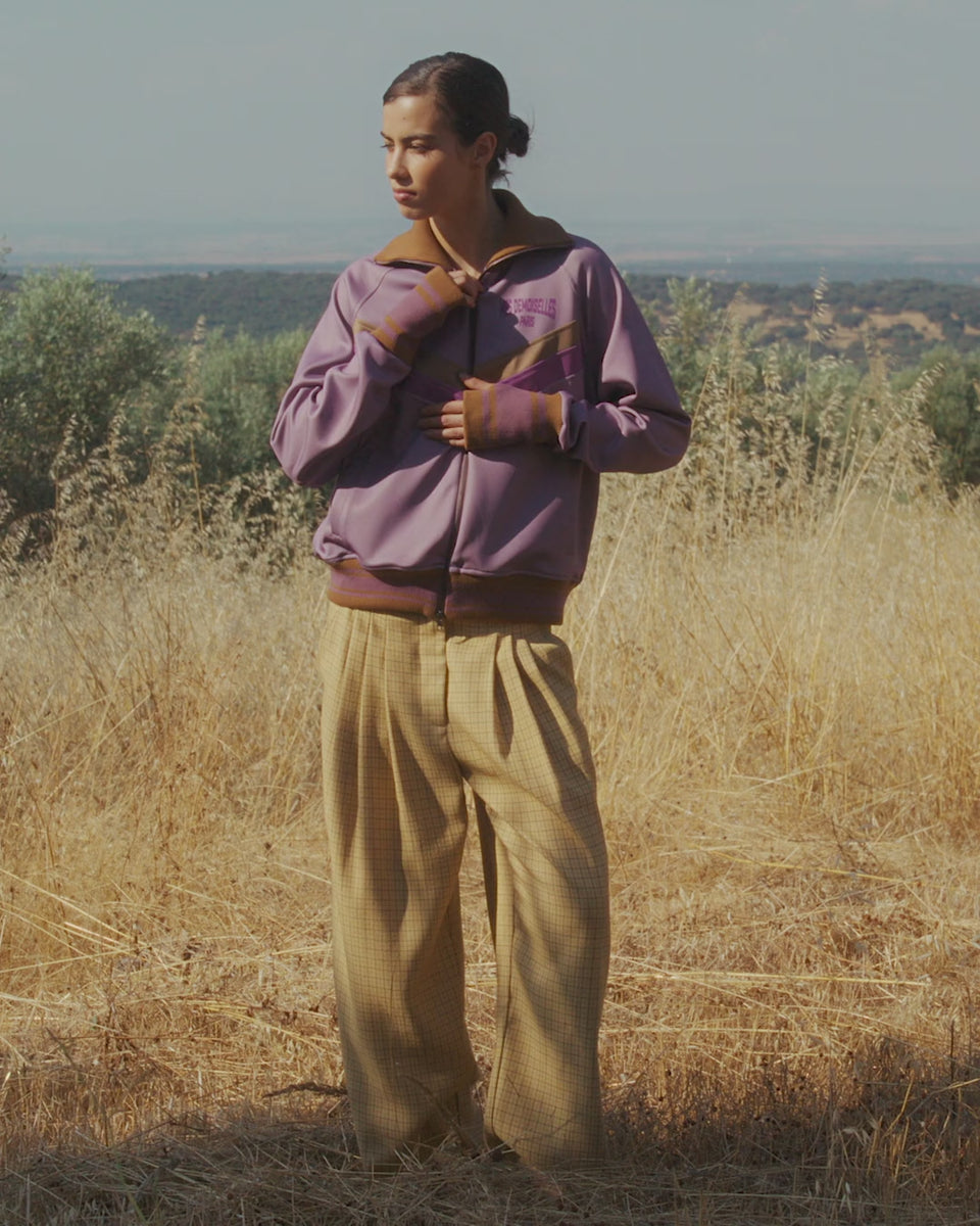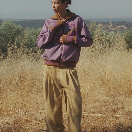 This track jacket-inspired piece charms with its soft lavender tone and subtly vintage feel.