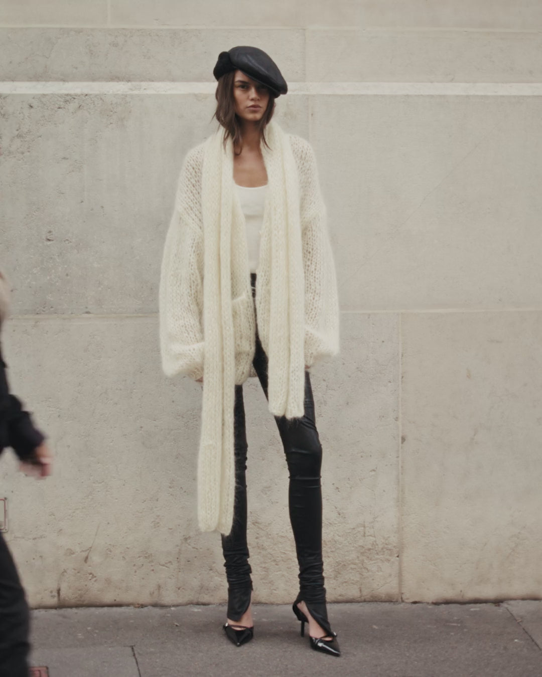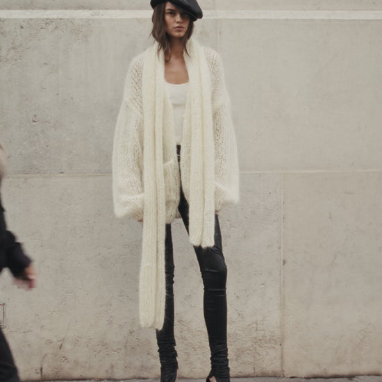 Tricoté à la main selon un savoir-faire traditionnel, ce long cardigan en mohair séduit par sa maille très aérée et son toucher poilu, emblématique de cette fibre naturelle. Il présente une encolure châle qui souligne son allure décontractée et élégante. Des poches plaquées sur le devant ajoutent une note pratique, tandis que le boutonnage discret permet de le fermer avec douceur. Pièce unique, réalisée artisanalement dans une teinte ivoire naturelle, symbole de chaleur et de raffinement.