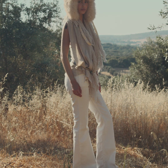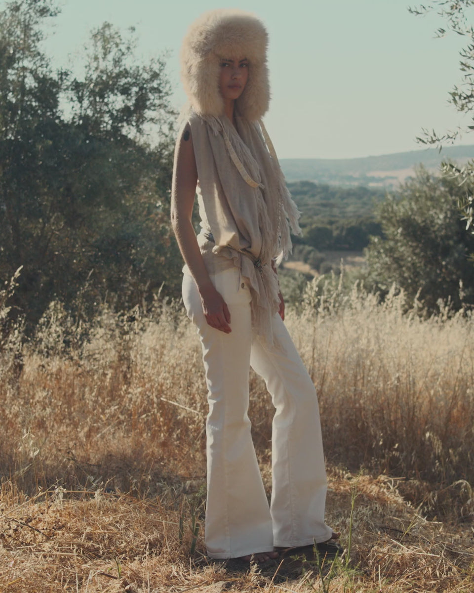 Chapka enveloppante en fausse fourrure écrue, rehaussée de légers reliefs plus foncés qui lui donnent un aspect vivant et texturé. Les côtés peuvent se remonter et se fixer à l’aide d’un bouton-pression discret, permettant de moduler le volume et de varier les portés selon l’envie ou la météo. Une pièce à la fois chaude, douce et pleine de caractère.