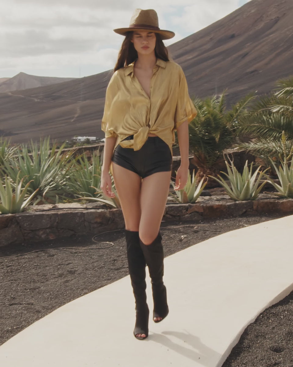 Chemise fluide kaki bronze en viscose légère soulignée d’un fil lurex doré pour un effet miroité et raffiné. Sa coupe courte et décontractée se distingue par des manches à revers, un ourlet arrondi et une matière souple qui permet de la nouer facilement à la taille. Non doublée, elle offre une transparence subtile et un tombé aérien. Un modèle élégant et contemporain, à porter avec le pantalon “Leone” pour un ensemble fluide et lumineux.