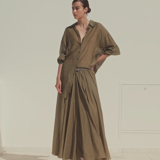 Jupe fluide en viscose satin, jouant d’un motif de carreaux anglais dans les tons kaki qui se fondent dans le modèle. Sa taille élastique assure un confort discret, tandis que son volume ample déploie une élégance aérienne à chaque mouvement.