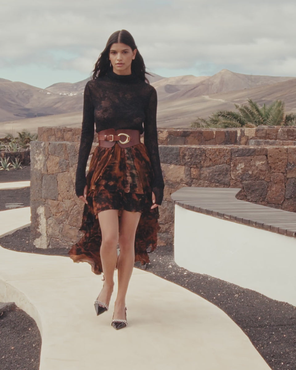 Cette jupe longue en viscose georgette séduit par sa légèreté et son mouvement fluide. Son motif tie & dye artisanal, aux nuances profondes de brun, cuivre et noir, rend chaque pièce unique et vibrante. Composée de volants superposés pour un effet dansant, elle présente une découpe arrondie plus courte sur le devant, qui révèle subtilement la jambe et apporte une touche contemporaine à la silhouette. Sa taille élastiquée assure confort et maintien tout au long de la journée.