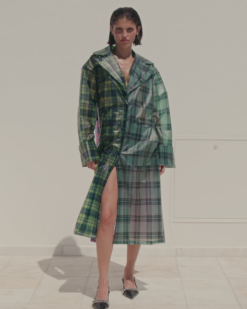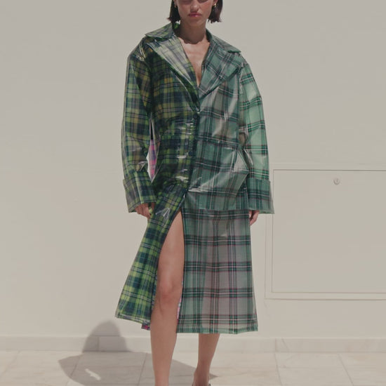 Imperméable long à l’imprimé tartan décliné dans des tons verts et navy. Sa coupe droite est structurée par une encolure tailleur et des manches longues, tandis que des poches plaquées viennent souligner son esprit pratique et intemporel.