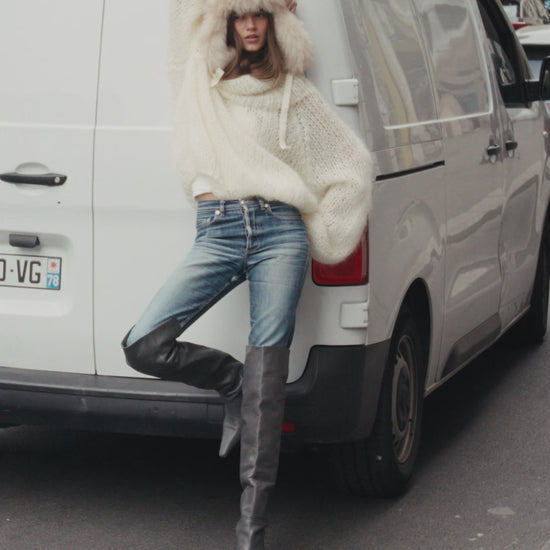 Pull oversize en mohair ivoire, tricoté à la main selon la tradition dans une maille aérée et poilue qui joue avec la transparence. Sa grande encolure se porte librement, dévoilant les épaules pour une allure féminine et décontractée. Les manches raglan et la coupe ample soulignent son esprit bohème et contemporain, tout en enveloppant la silhouette d’une élégance naturelle.
