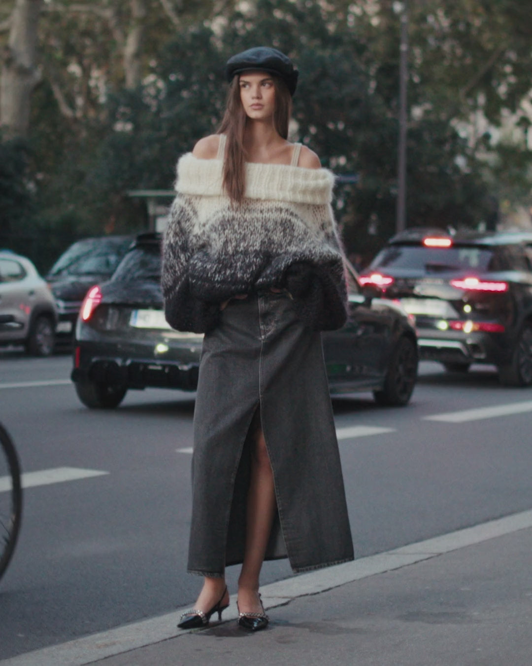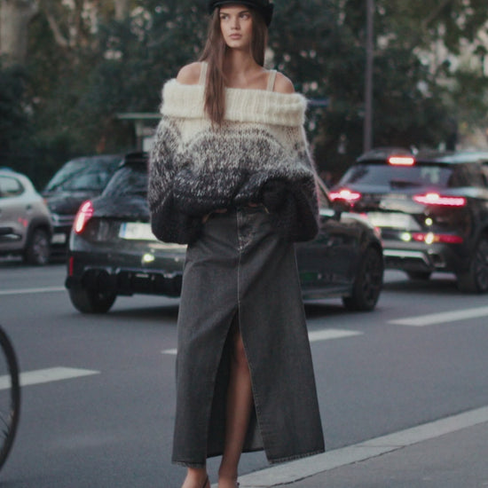 Pull oversize en mohair dégradé noire et ivoire, tricoté à la main selon la tradition dans une maille aérée et poilue au toucher vaporeux. Le ton le plus clair se pose près du visage, apportant éclat et douceur au teint. Sa grande encolure glisse sur les épaules pour une allure féminine et décontractée, tandis que les manches raglan et la coupe ample révèlent un esprit bohème et contemporain.