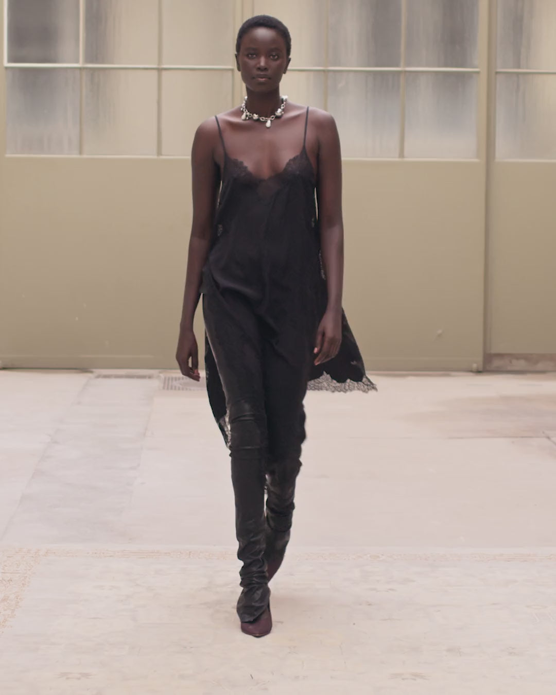 Top long confectionné en soie crêpe de chine charcoal d’une grande délicatesse, au tombé fluide et raffiné. Les bretelles fines et réglables permettent un ajustement parfait, tandis que la dentelle ton sur ton souligne avec élégance l’encolure et les côtés. Des fentes profondes sur les côtés apportent légèreté et mouvement, pour un porté sensuel et aérien. Ce modèle se porte aussi bien seul qu’en superposition, idéalement associé au pantalon “Berla” du même thème pour une silhouette subtilement féminine et contemporaine.