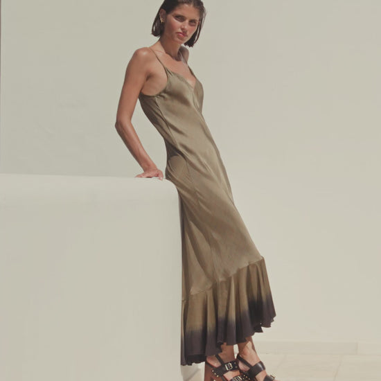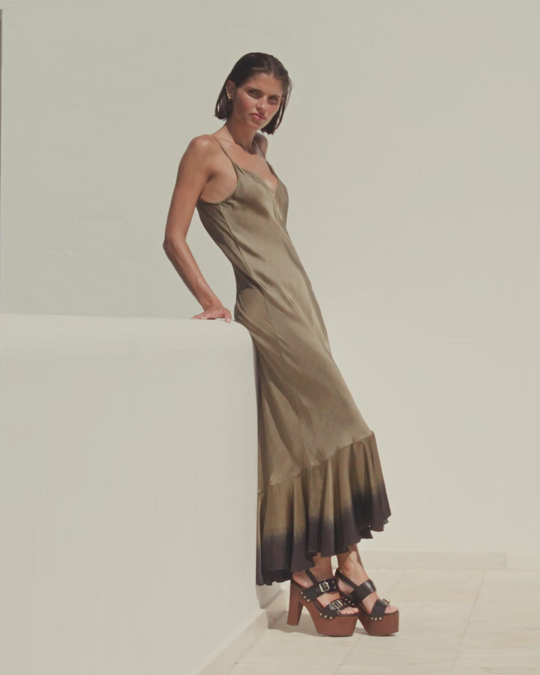Robe fluide en viscose satin, ornée d’un jeu de carreaux anglais dans des nuances de kaki qui s’assombrissent doucement vers un navy profond au bas du modèle. Sa coupe droite se pose avec légèreté, rehaussée de fines bretelles réglables. Le bas de la robe s’anime d'un volant délicat, offrant un mouvement aérien et une allure poétique.