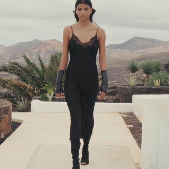 Confectionnée en soie fluide, cette robe longue séduit par son tombé souple et son éclat raffiné. L’encolure est délicatement bordée de dentelle façon "Calais", travaillée avec finesse pour sublimer le décolleté tout en douceur. Ses bretelles fines et réglables assurent un ajustement parfait, tandis que la teinte noire profonde afine la silhouette d’une façon subtile et élégante. Légère et sensuelle, cette pièce peut se porter seule pour une allure intemporelle ou glissée sous un pull fin pour un contraste moderne et raffiné.
