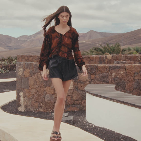 Ce short en simili cuir souple séduit par son allure moderne et son toucher doux au fini légèrement satiné. Sa coupe fluide et sa taille élastiquée offrent confort et liberté de mouvement, tandis que la ceinture fine intégrée souligne la silhouette avec élégance. Doté de poches sur les côtés et de revers à la base, il combine style et praticité. Sa teinte noire, intemporelle et chic, permet de l’associer facilement à une maille oversized ou à une chemise fluide pour un look contemporain et audacieux.