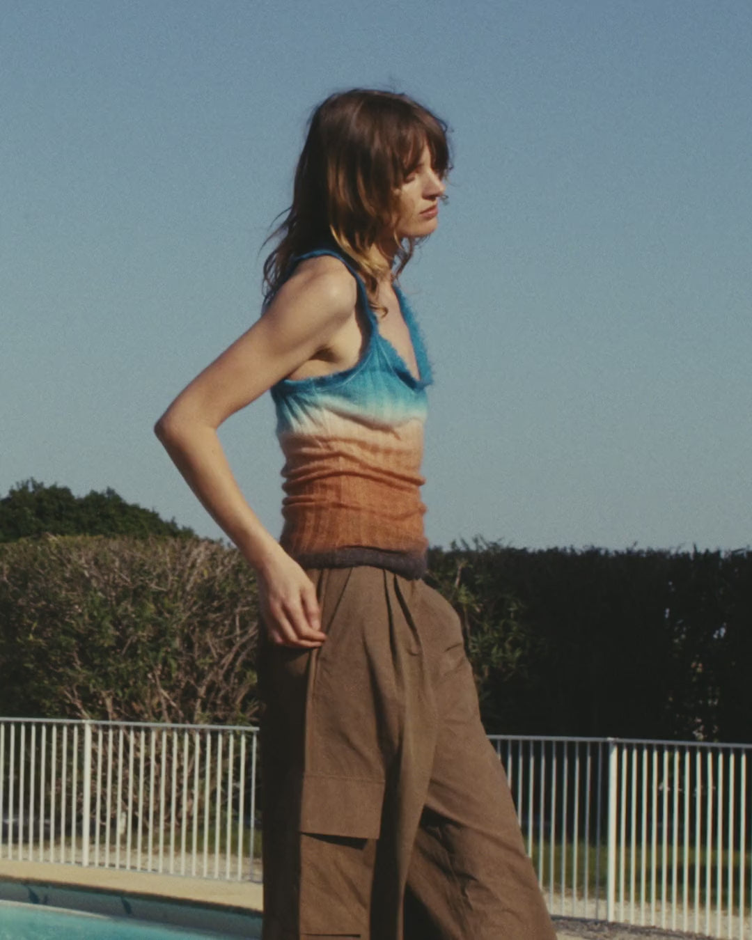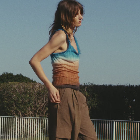 Débardeur ajusté en mélange de super kid mohair, d’une douceur exceptionnelle et d’une légèreté aérienne. Son effet tie & dye artisanal crée un dégradé subtil allant du bleu turquoise vif vers des tons terre cuite et anthracite, évoquant un coucher de soleil sur la mer. Les bords francs apportent une finition brute et contemporaine, tandis que la maille côtelée souligne la silhouette tout en gardant une élasticité naturelle. Une pièce lumineuse et moderne, parfaite en solo ou associée au long cardigan du thème "Finn"