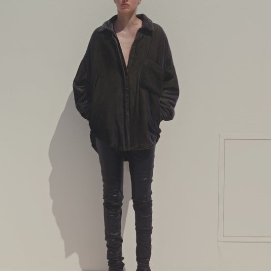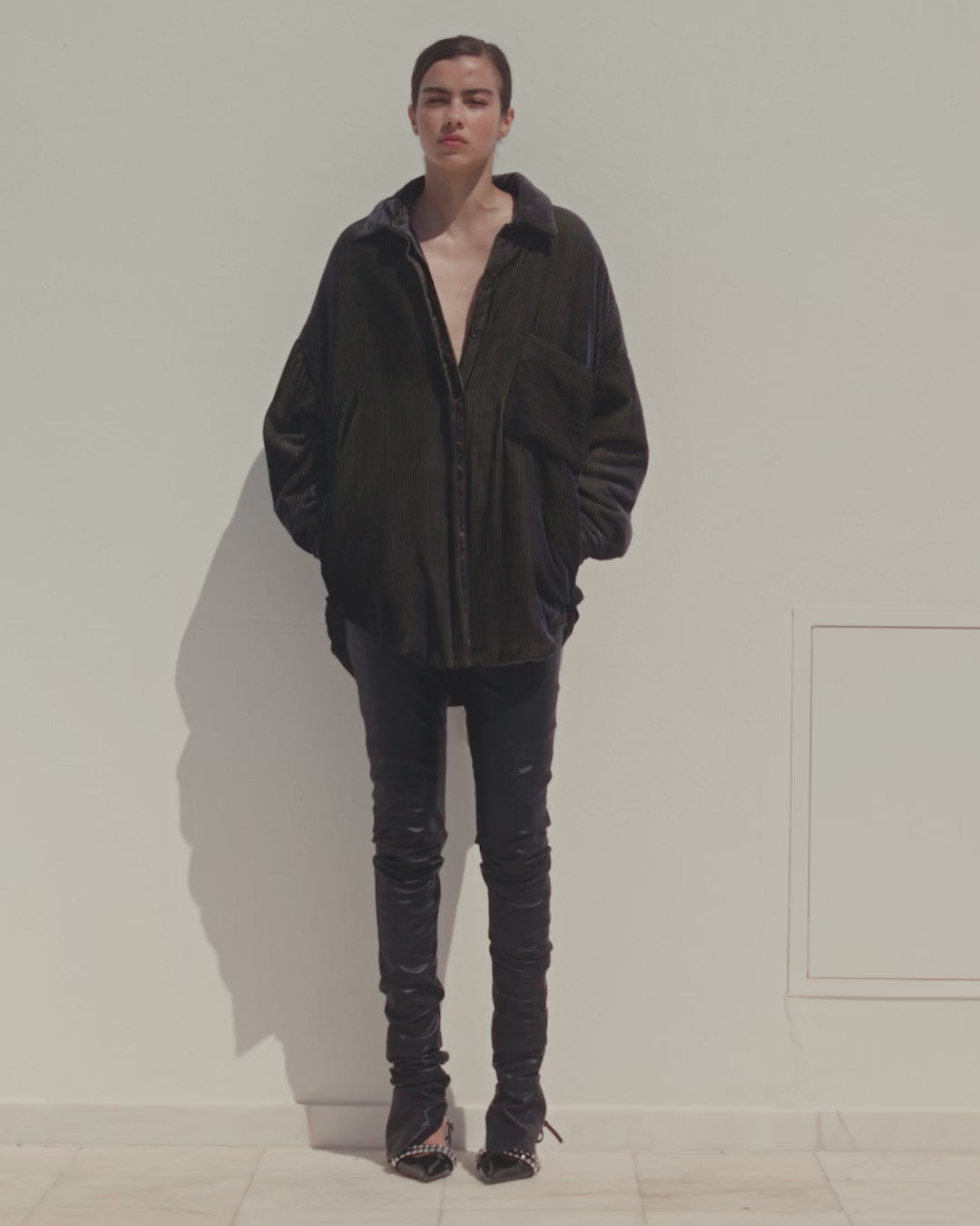 Veste chemise à la coupe souple, réalisée en velours de soie dévoré. Son coloris aux effets changeants décline des tons de vert et de bleu, soulignant son allure raffinée. Le modèle présente une coupe oversize fermée par une patte de boutonnage, une poche plaquée sur la poitrine et des poignets resserrés, pour une touche à la fois élégante et décontractée. Idéal à porter avec le pantalon "Valou" du même thème. Modèle surtaillé.