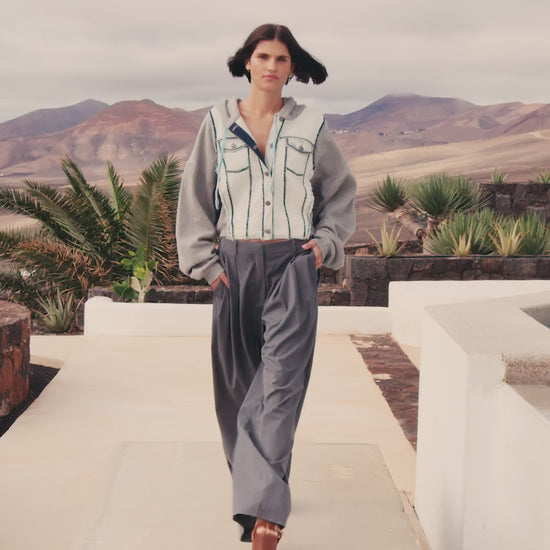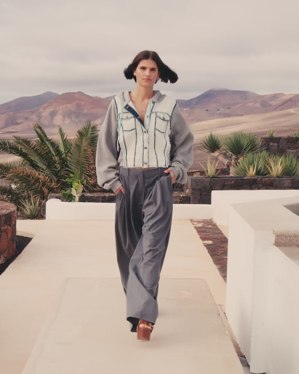 Allure urbaine et esprit décontracté pour cette veste hybride mêlant denim et molleton. Le corps en jean clair, aux coutures contrastées bleue indigo brut et légèrement effilochées, se marie à des manches et une capuche en molleton gris chiné pour un look contemporain et confortable. Fermeture par boutons pression métalliques, poches plaquées à rabat sur la poitrine et lien de serrage à la capuche.